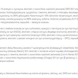- BrainBoost 2.0 Składniki wspierające koncentrację, wpływające na aktywację fal alfa w mózgu, co sprzyja osiągnięciu stanu relaksu przy jednoczesnym zachowaniu czujności umysłowej, łagodzące uczucie zmęczenia i znużenia. Recovery Składniki wykazujące działanie adaptogenne, poprawiające odporność na stres, promujące zasypianie i dobre samopoczucie. Wspomagające odprężenie, oczyszczenie umysłu. DayStart Składniki wpływające na ochronę DNA, białek i lipidów przed uszkodzeniem oksydacyjnym oraz zmniejszenie starzenia…